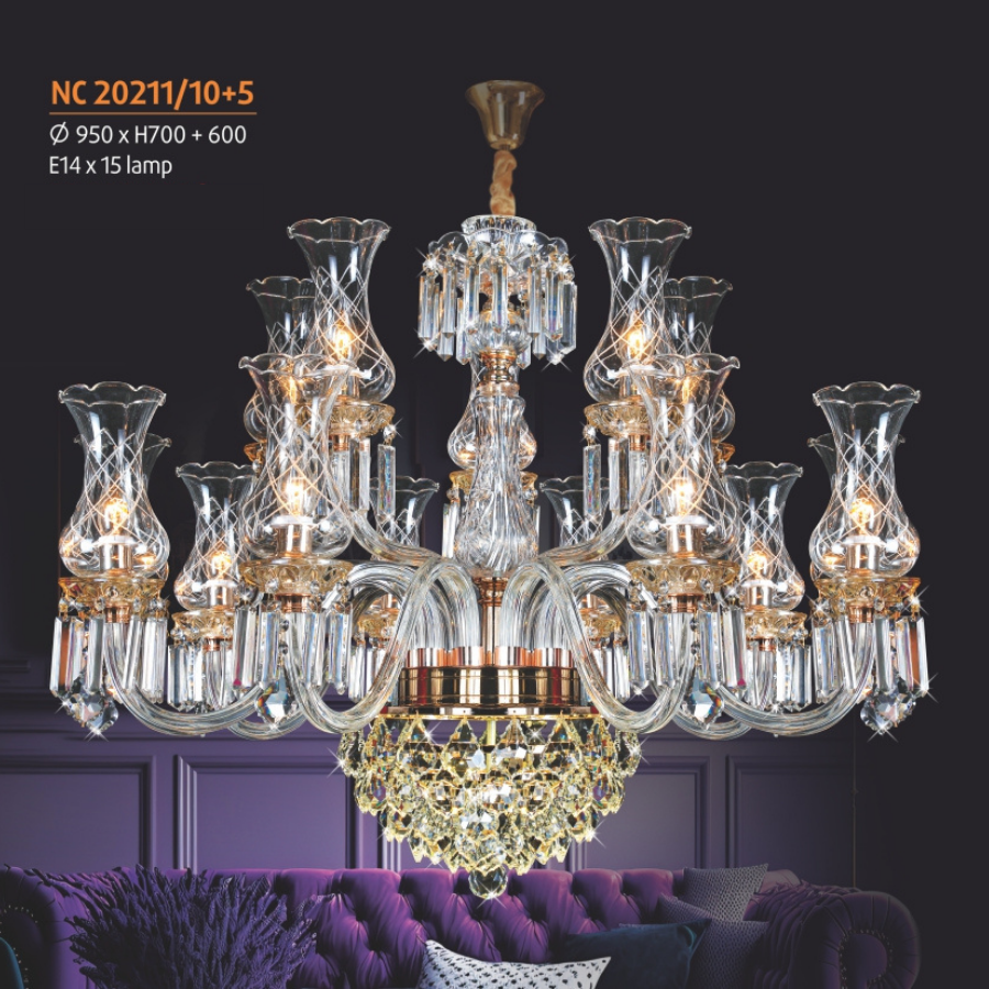Ø950xH700+600Kiểu Đèn chùm phòng khách, Đèn chùm phòng ăn, Đèn chùm phòng ngủ, đèn chùm sảnh Vật liệu Thân Kim Loại - Pha lê Nguồn điện áp AC/DC Mã sản phẩm NL-NC 20211