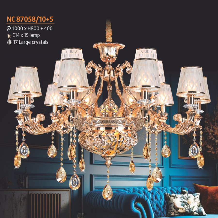 Ø950xH600+500Kiểu Đèn chùm phòng khách, Đèn chùm phòng ăn, Đèn chùm phòng ngủ, đèn chùm sảnh Vật liệu Thân Kim Loại - Pha lê Nguồn điện áp AC/DC Mã sản phẩm NL-NC 87058