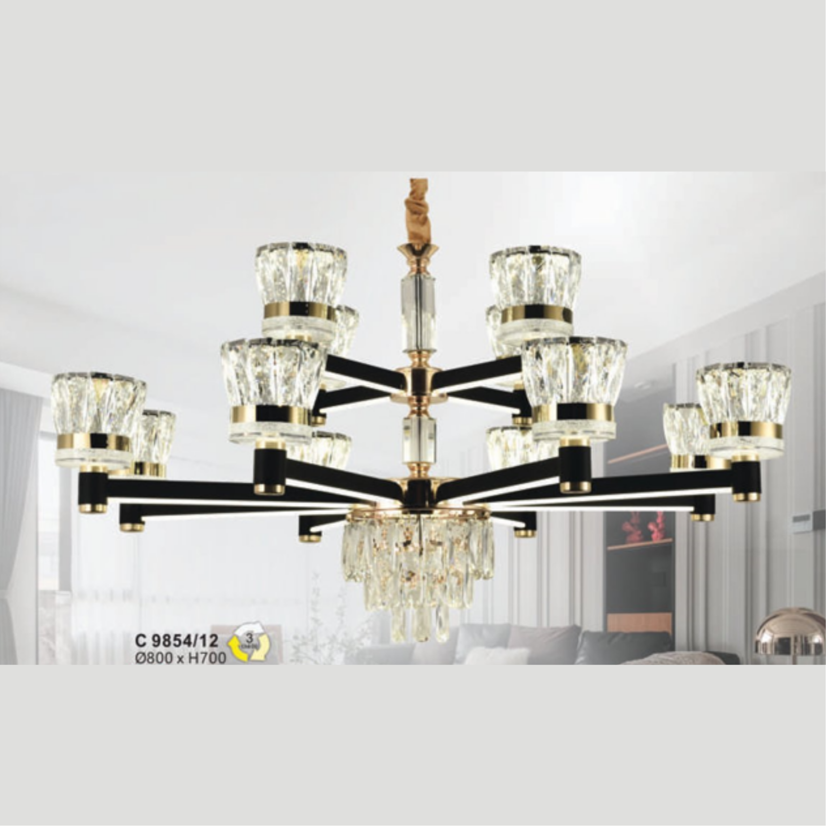 đại diện cho sự giàu sang, quý phái bậc nhất, thể hiện đẳng cấp cho không gian sống của khách hàng.Đèn chùm QN-C9854/12
