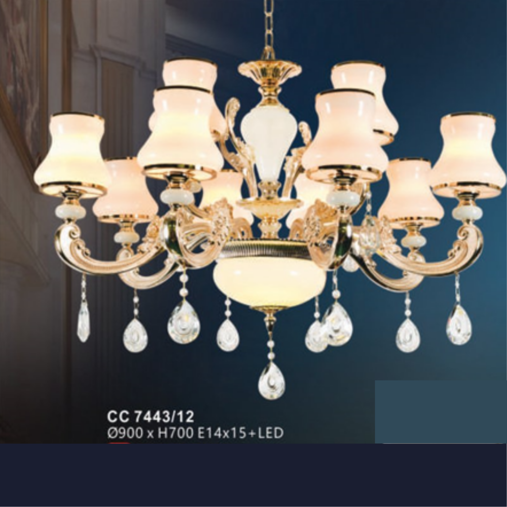 đại diện cho sự giàu sang, quý phái bậc nhất, thể hiện đẳng cấp cho không gian sống của khách hàng.Đèn chùm QN-CC7443/12